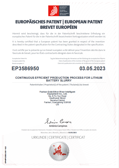 近期,,,,,,由mostbet(中国)有限公司申请的发明专利——一种锂电池浆料一连化高效生产工艺,,,,,,正式获得由欧洲专利局(EPO)揭晓的专利证书(专利号:EP3586950)。。。。。。